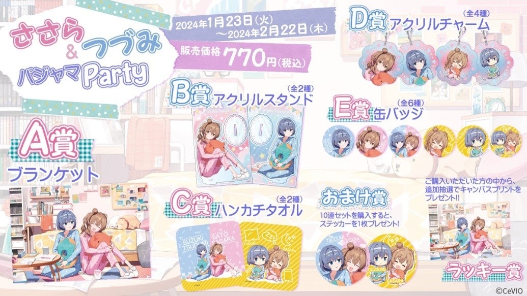 くじでしか手に入らないアイテムがラインナップされており、A賞はもふもふブランケット、B賞はアクリルスタンド、C賞はハンカチタオル、D賞はアクリルチャーム、E賞は缶バッジです。