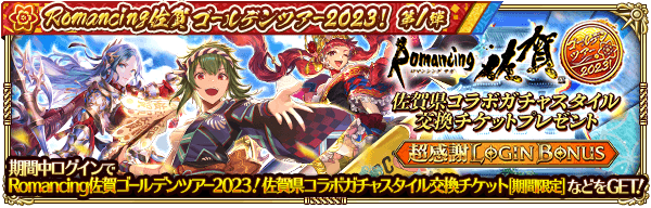 <1> Romancing佐賀ゴールデンツアー2023!佐賀県コラボガチャスタイル交換チケットプレゼント超感謝ログインボーナス開催!
