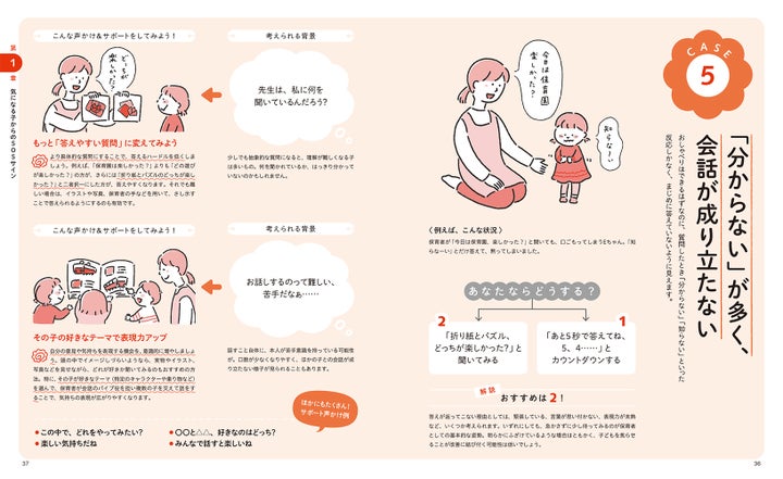 落ち着きがない、ボーっとしている、わからないことが多いなどの子どもたちの行動や言葉に焦点を当て、具体的なサポート方法を声かけ例とともに紹介しています。