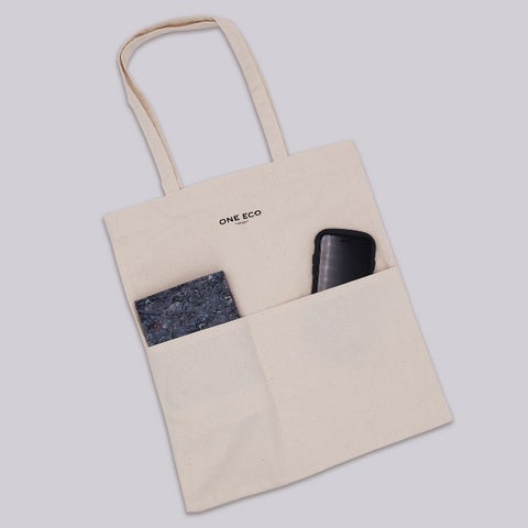 「本袋(大)」は、フリーサイズのポケット2つがついた100%コットンのトートバッグです。