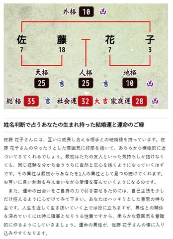 「うらなえる」という占いコンテンツポータルサイトでは、姓名判断を使って結婚運を占うコンテンツが提供されています。