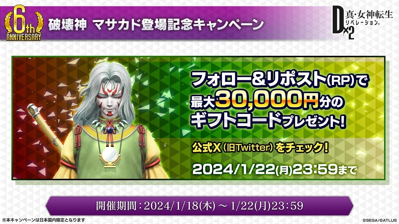 • 2024年1月18日から2月1日まで、新★5悪魔「破壊神マサカド」の召喚開催