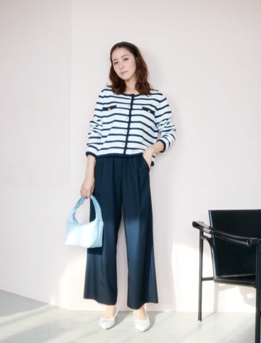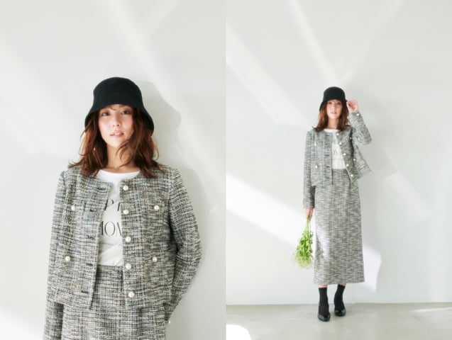 - ツイードやメランジ、ジャカード、ファンシーヤーンなどの旬な素材を使用したクリーンなデザイン