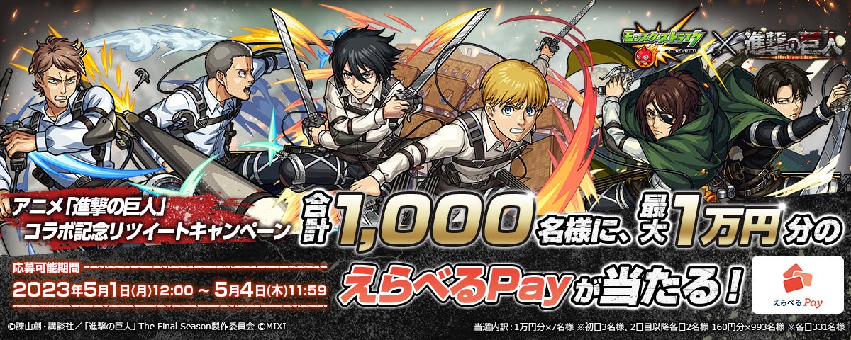 そのほか、モンスト公式キャンペーンTwitterでは、「えらべるPay」が当たるアニメ「進撃の巨人」コラボ記念3日連続RTキャンペーンも実施します。