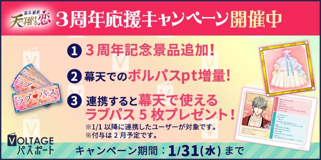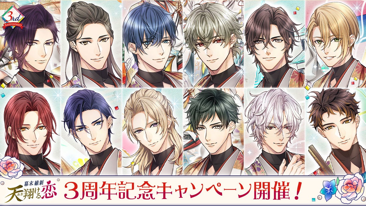株式会社ボルテージは、ボル恋タイトル「幕末維新 天翔ける恋」が1月19日に配信3周年を迎えました。