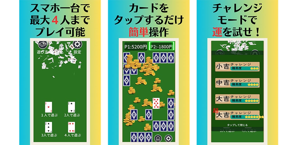 「トランプゲーム お金 ~the money~」は、遊びやすさを重視し開発され、最大4人まで一緒に遊べます。