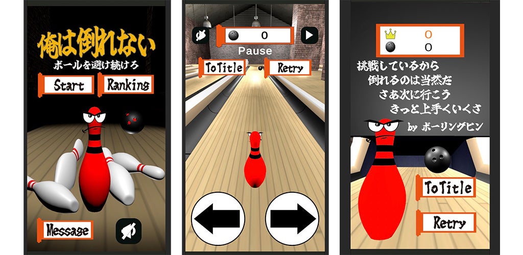 ボウリングピンを操作し、ボールを回避して遊ぶ「絶対に倒れない ボウリングピンアクションゲーム」。