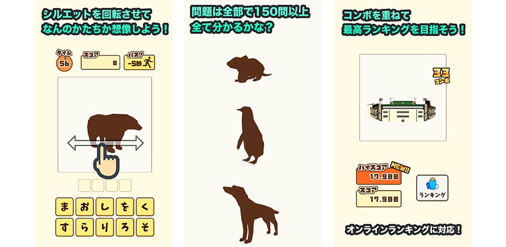 シルエットをスワイプで回転させて、なんのかたちかを想像し“早押し”で答えていくゲームになっています。
