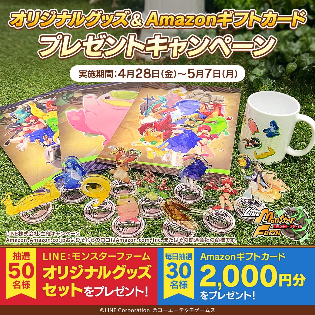 4/28(金)から5/7(日)の期間、「LINE:モンスターファーム」公式Twitter(@MonsterFarm_L)をフォローし、対象ツイートをリツイートいただいた方の中から、即時抽選で毎日30名様に2,000円分のAmazonギフトカードが当たるTwitterフォロー&リツイートキャンペーンを開催します。さらにWチャンスとして、後日抽選で「LINE:モンスターファーム」オリジナルグッズセットが合計50名様に当たります。