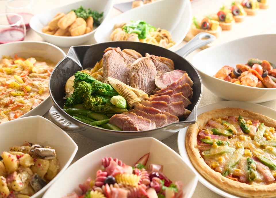 また、スイーツと一緒に楽しめるランチビュッフェもご用意しており、豚肉のローストや春の味覚を揃えた温製料理など、様々な料理をお楽しみいただけます。