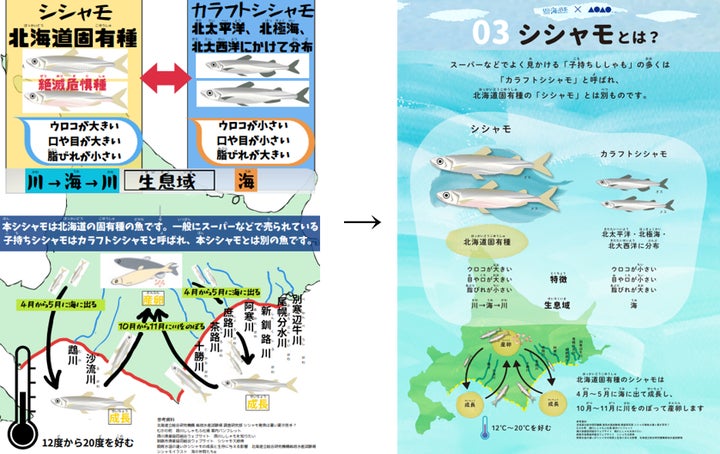 彼らは北海道むかわ町でのフィールドワークを通じて「シシャモ」の漁獲量の減少を知り、多くの人にその現状を伝えたいという思いから展示を企画しました。