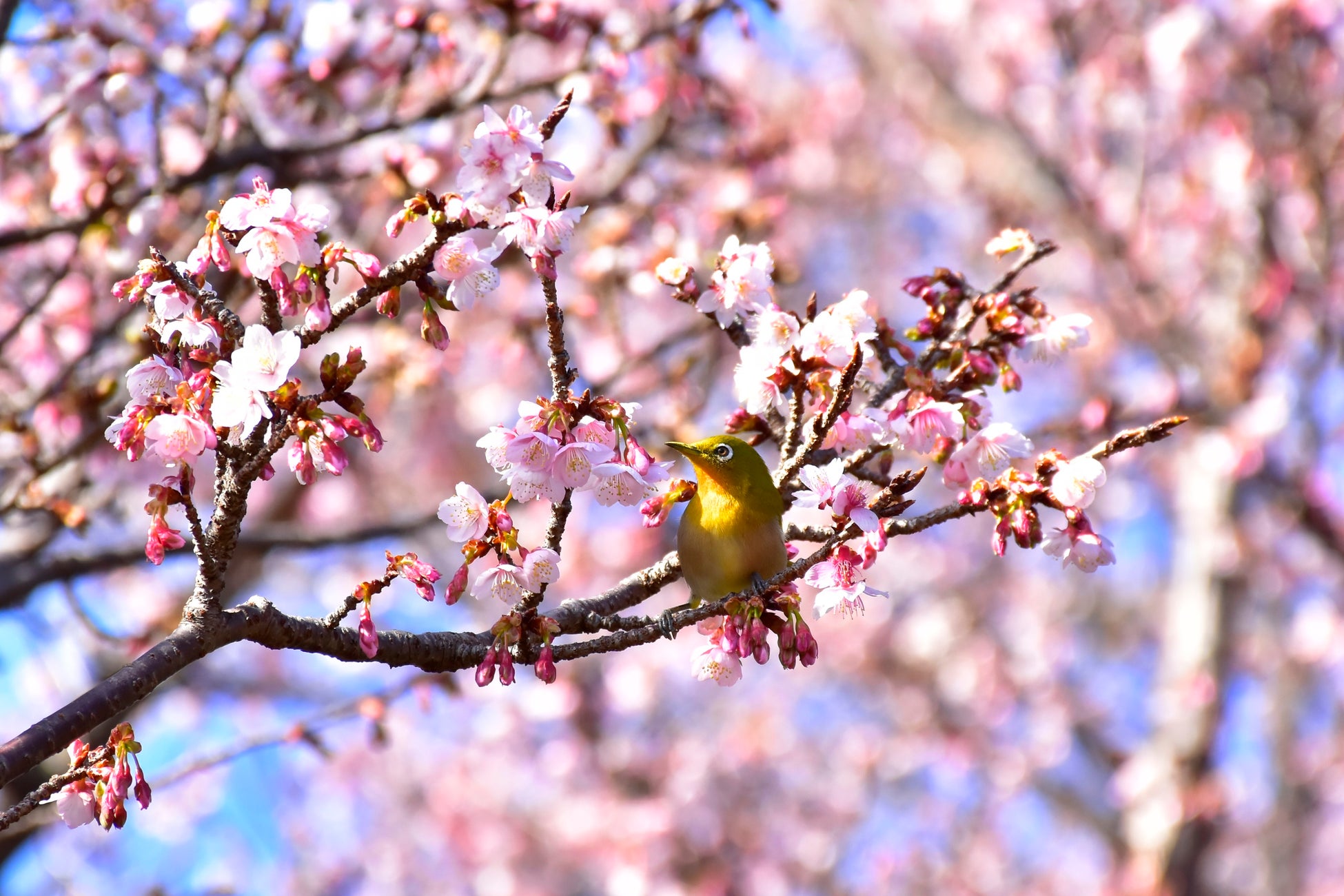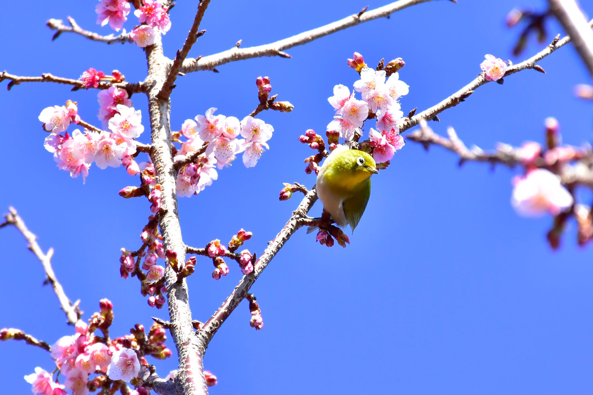 寒桜は1月上旬から咲き始め、開花時にはメジロが訪れ、花の蜜を吸う姿が愛らしいです。