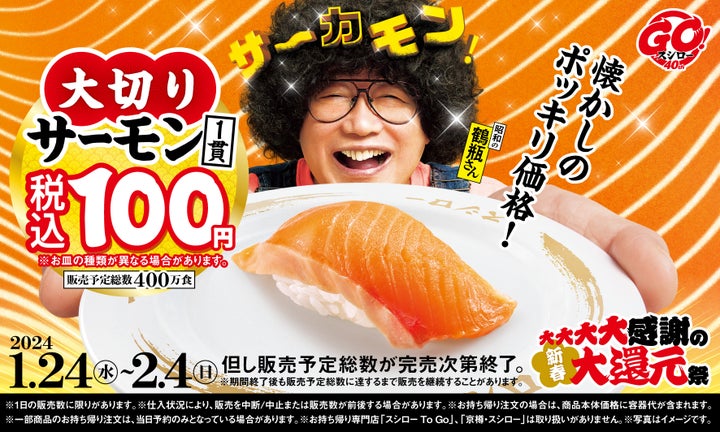 目玉商品として、鮮度抜群のサーモンを大切りにして100円で提供する「大切りサーモン」が登場します。