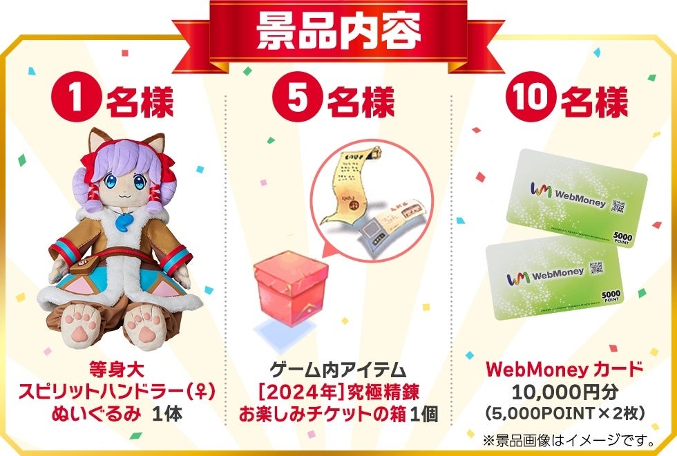 抽選で等身大スピリットハンドラーぬいぐるみやゲーム内アイテム、WebMoneyカードがプレゼントされます。