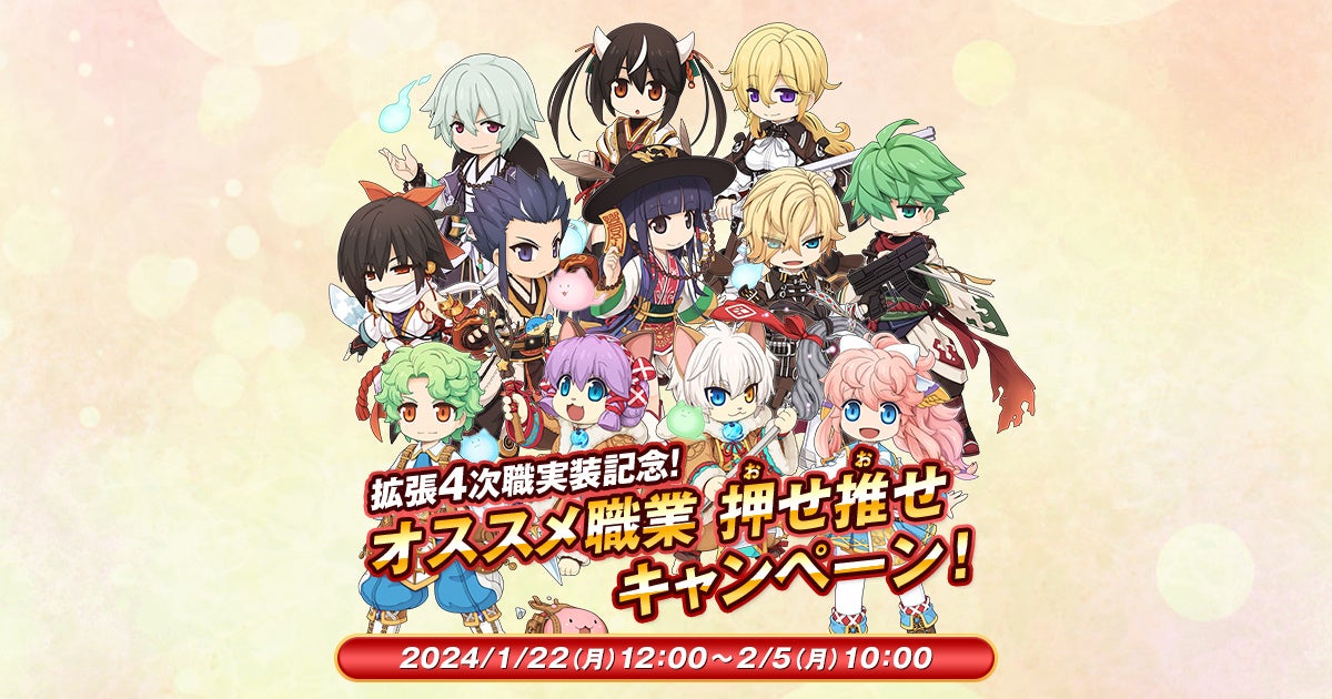 - 2024年1月22日から「拡張4次職実装記念!オススメ職業 押せ推せキャンペーン!」が開催される