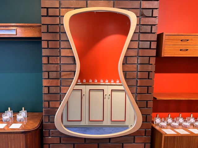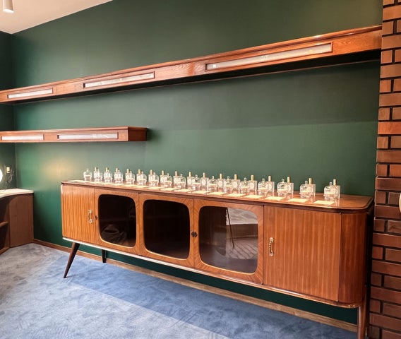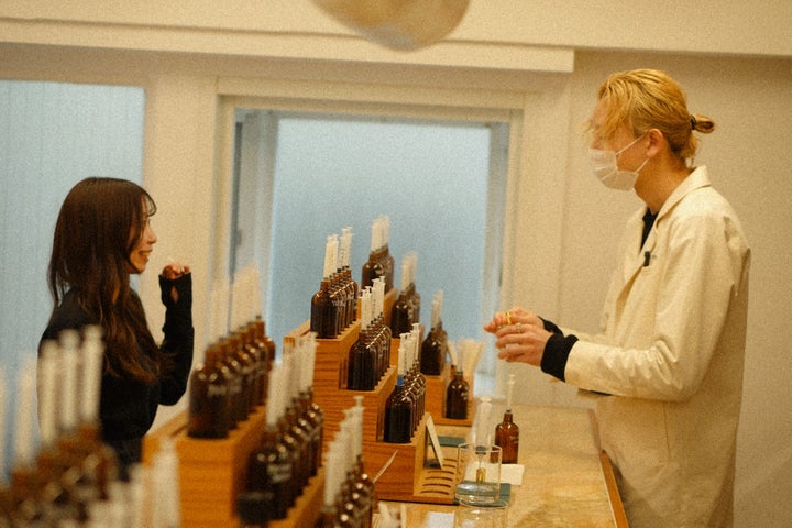 - ミントブルーの調合ブースでは自分だけの香りを楽しむことができる