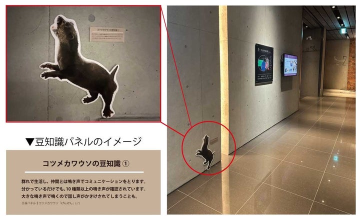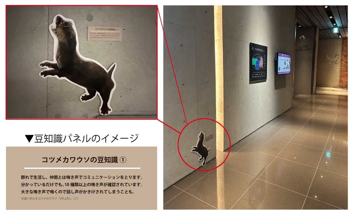 まず、館内にげんげんの全身パネルが設置され、パネルを探したり写真を撮ったりしながら楽しくコツメカワウソについて学ぶことができます。