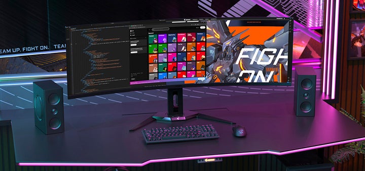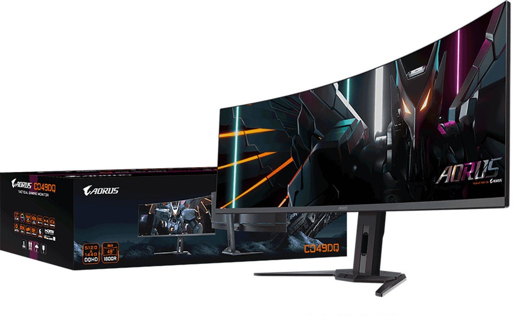 - AORUS CO49DQは49インチの曲面型有機ELモニターで、5120×1440のDQHD解像度と144Hzのリフレッシュレートを持つ