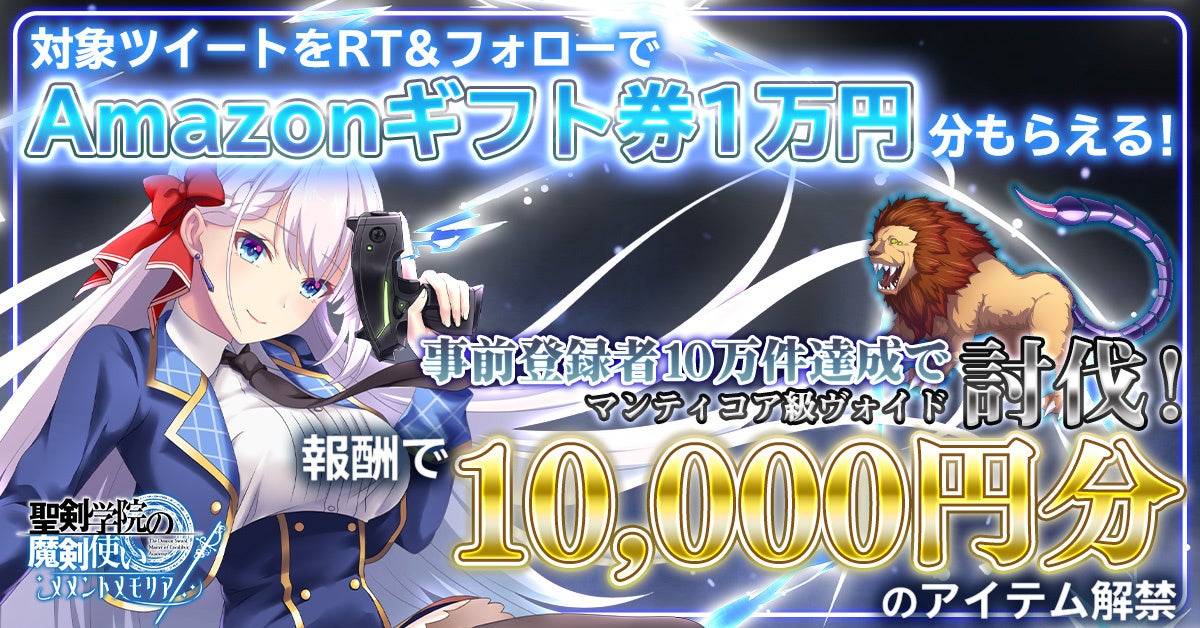 『聖剣学院の魔剣使い』は事前登録イベントの開始を記念して、ゲーム公式Twitterにてフォロー&RTキャンペーンを開催します。参加者の中から抽選で5名様に、Amazonギフト券1万円分が当たります。毎日参加できるのでお見逃しなく!