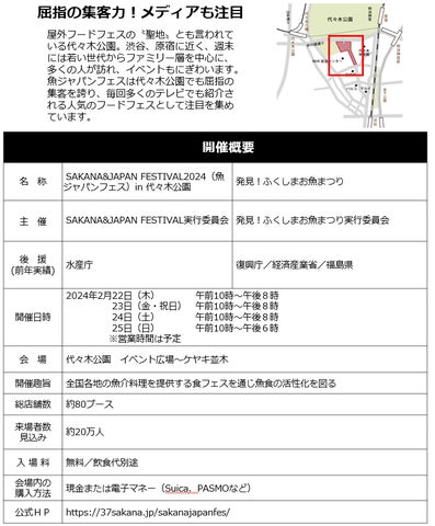 - 2024年2月22日(木)~25日(日)の4日間、東京都渋谷区の代々木公園で「SAKANA&JAPAN FESTIVAL2024(魚ジャパンフェス) in 代々木公園」が開催される。