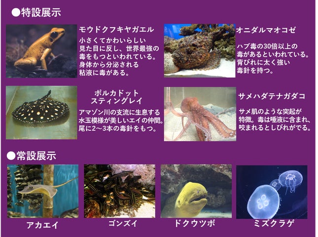 特設展示室では、12種類の「毒」を持つ生き物たちを展示し、オリジナル解説で危険レベルや対処法などを紹介します。