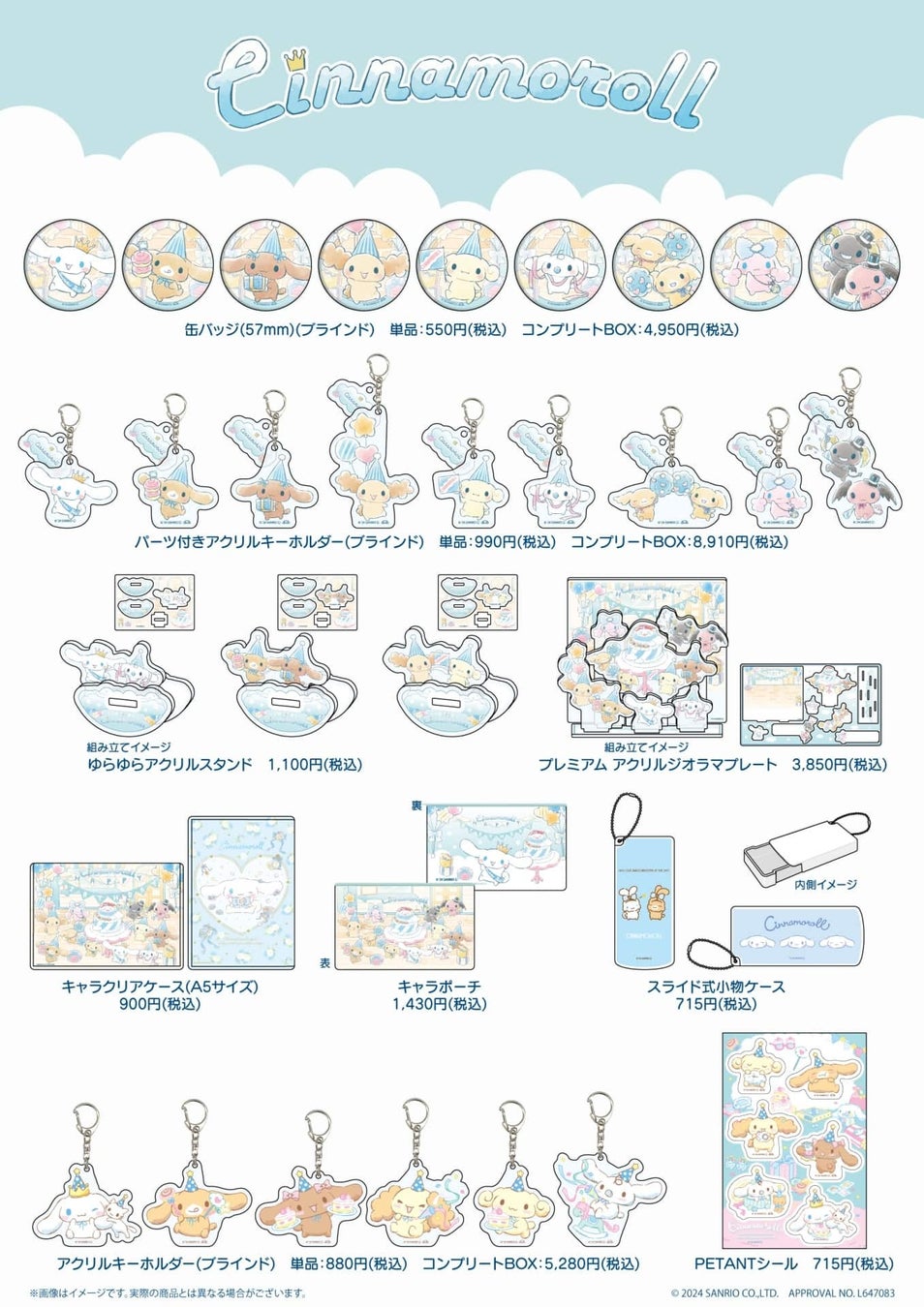 缶バッジ、アクリルキーホルダー、アクリルスタンド、アクリルジオラマプレート、キャラクリアケース、キャラポーチ、スライド式小物ケース、PETANTシール、ポストカード