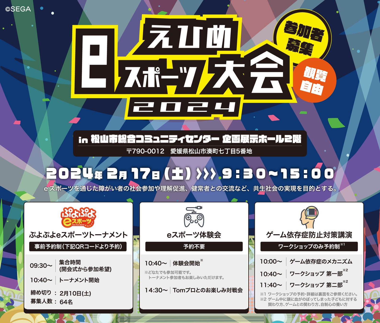 - えひめeスポーツ大会、ぷよぷよeスポーツ大会、eスポーツ体験会、ゲーム依存防止対策講演、ぷよぷよeスポーツトーナメント
