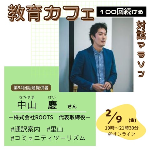 2月9日(金)にオンラインで開催される教育カフェマラソンについて、話題提供者の中山慶さんのプロフィールやタイムテーブルが公開されました。