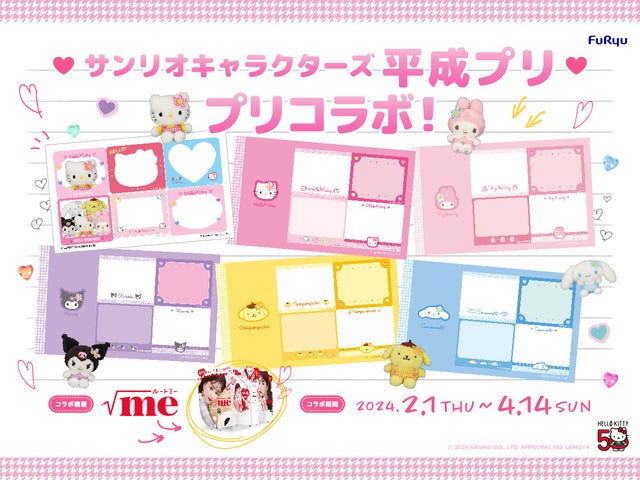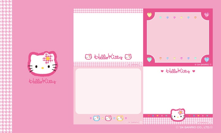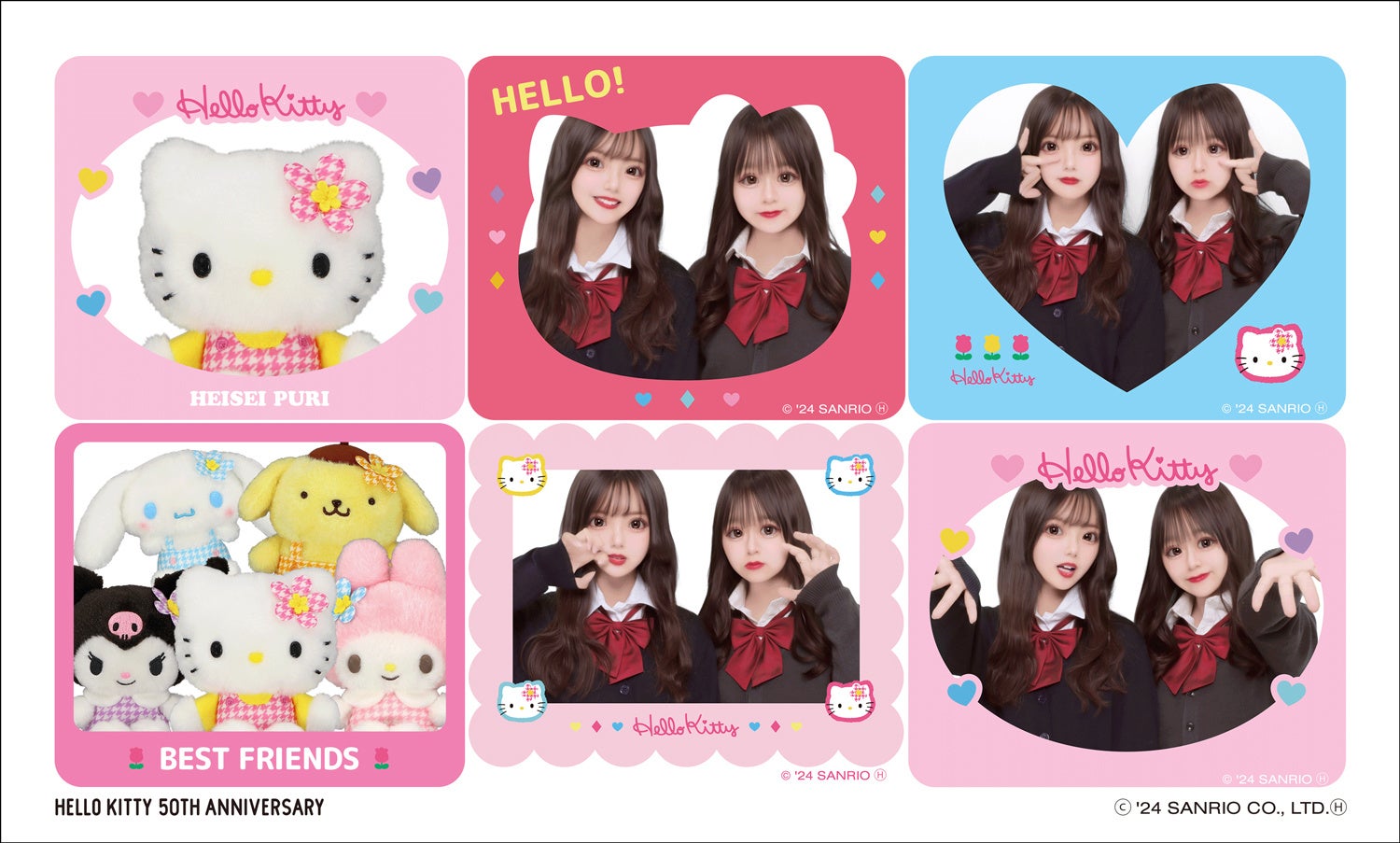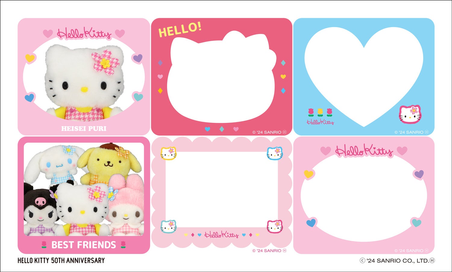 - 撮影フレーム&シールふちセットには、ハローキティや他のサンリオキャラクターが登場し、90年代のプリントシールを思い起こさせるようなデザインが魅力
