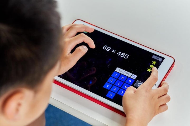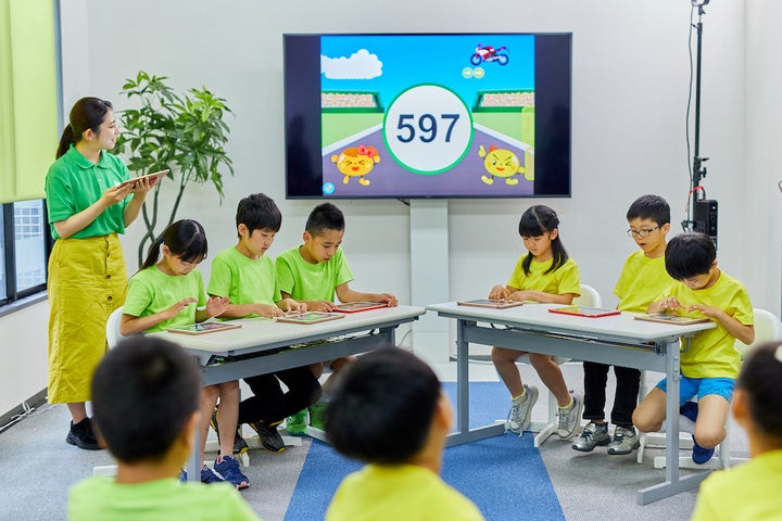 教室では、子供たちは自宅で学習した成果を披露し、競争を楽しむ反転学習スタイルを取り入れています。