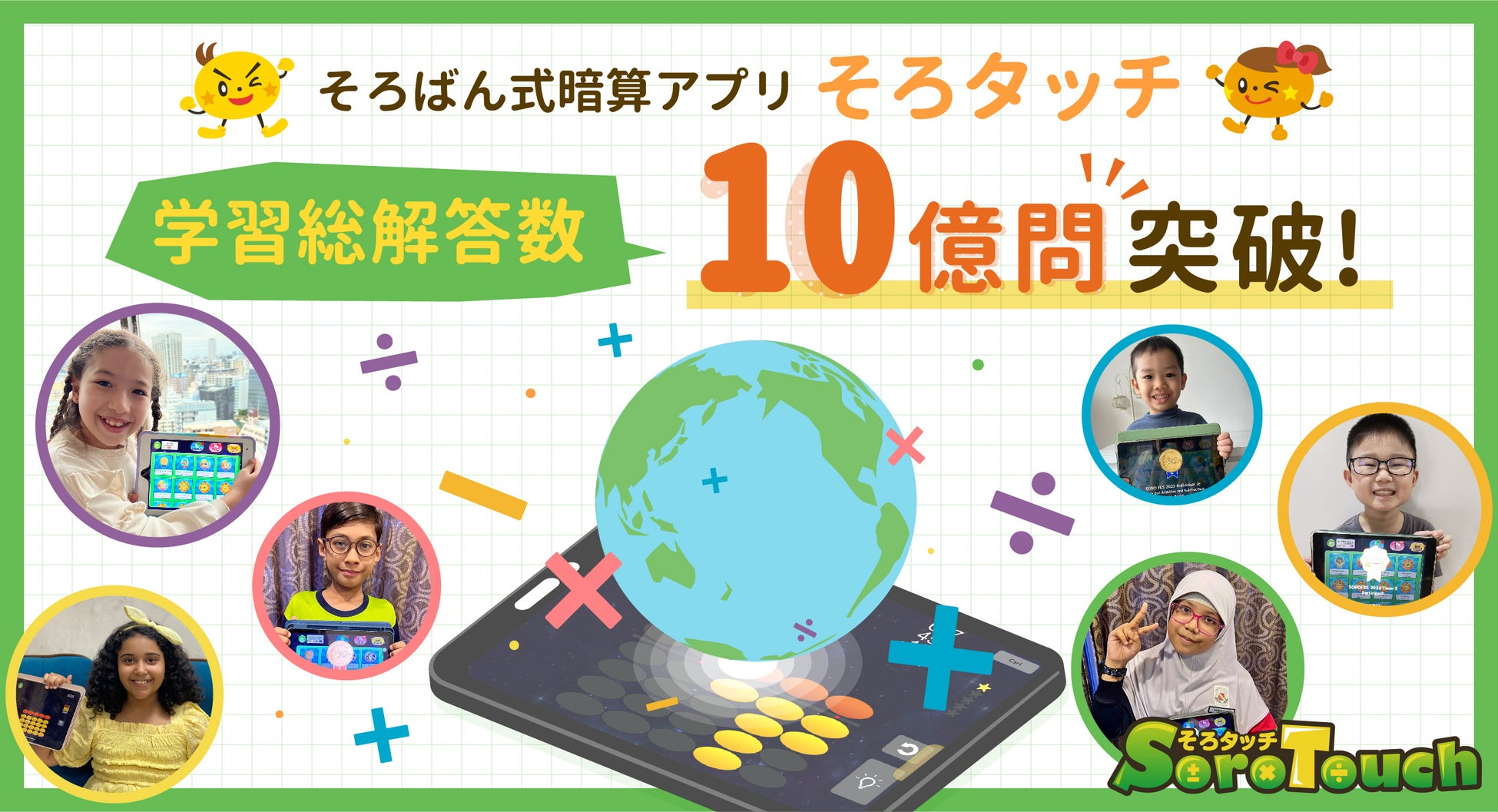 2023年12月、そろばん式暗算学習アプリ「そろタッチ」は、世界中の子どもたちから集まった解答数が10億問を突破しました。