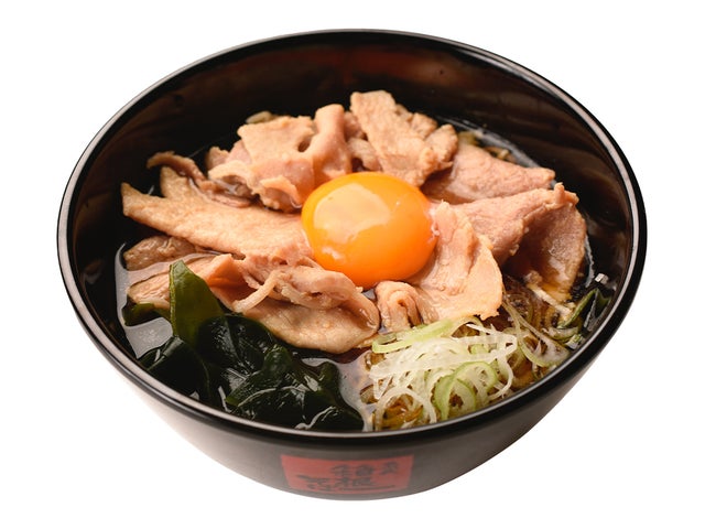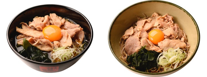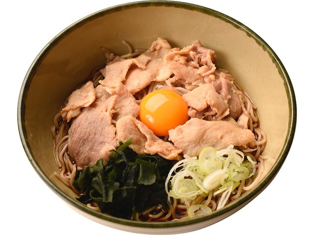 後者は黄金騎士の金色の鎧を彷彿とさせる生卵が中央にトッピングされた月見肉そばです。