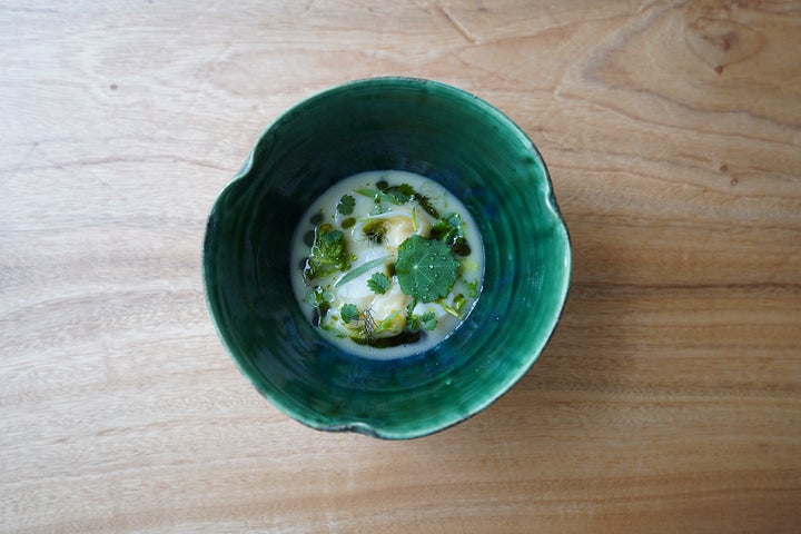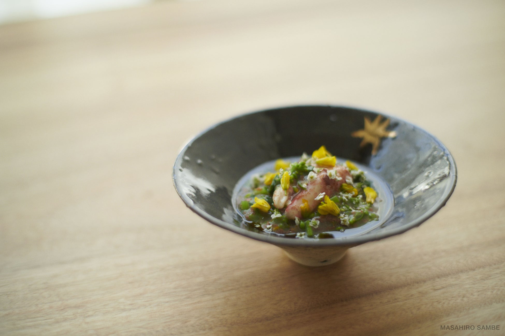 発酵さつまいもと帆立、チーマディラパを組み合わせた料理は、春の訪れを感じさせる一皿で、秋のさつまいもと冬の菜の花が調和しています。
