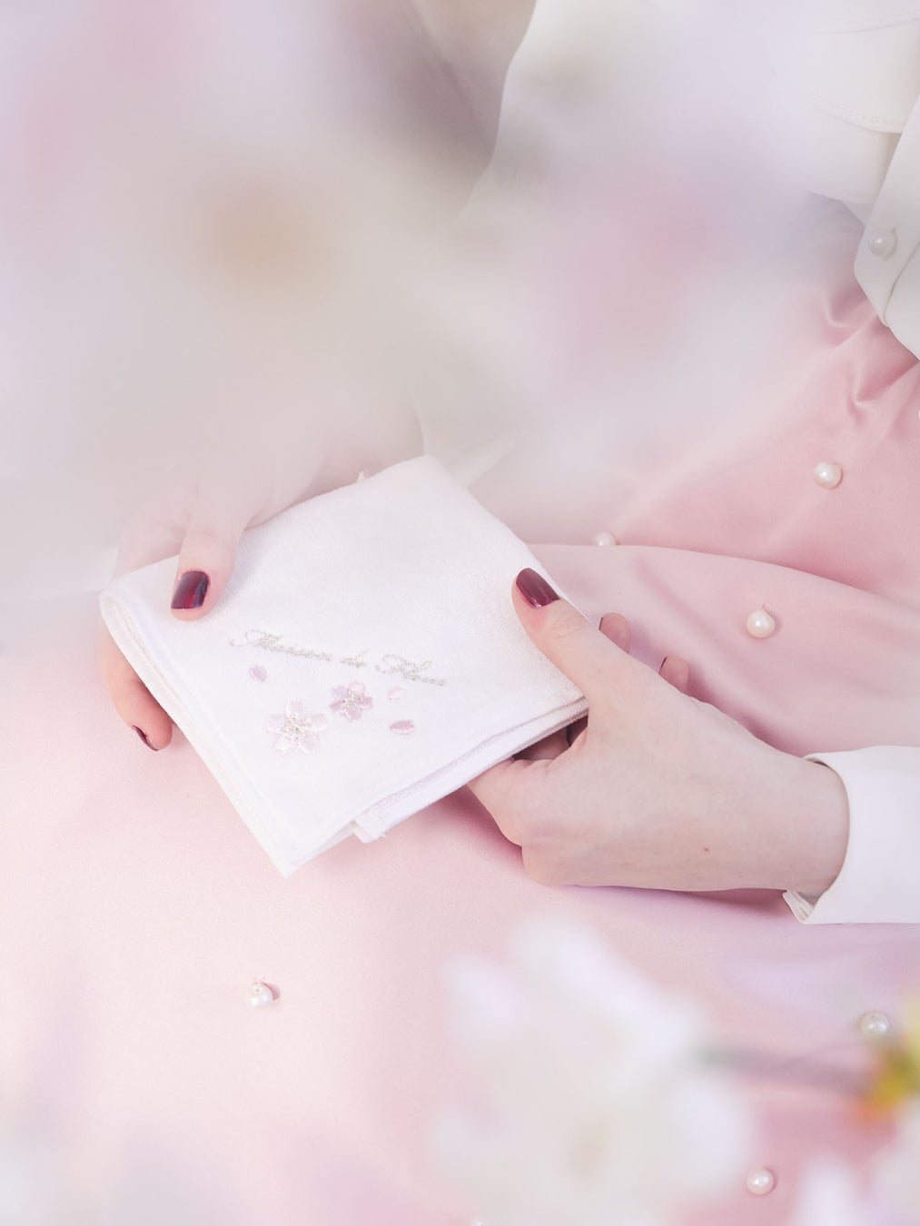 - ジャカード素材に立体的な桜モチーフとパールを組み合わせたデザイン