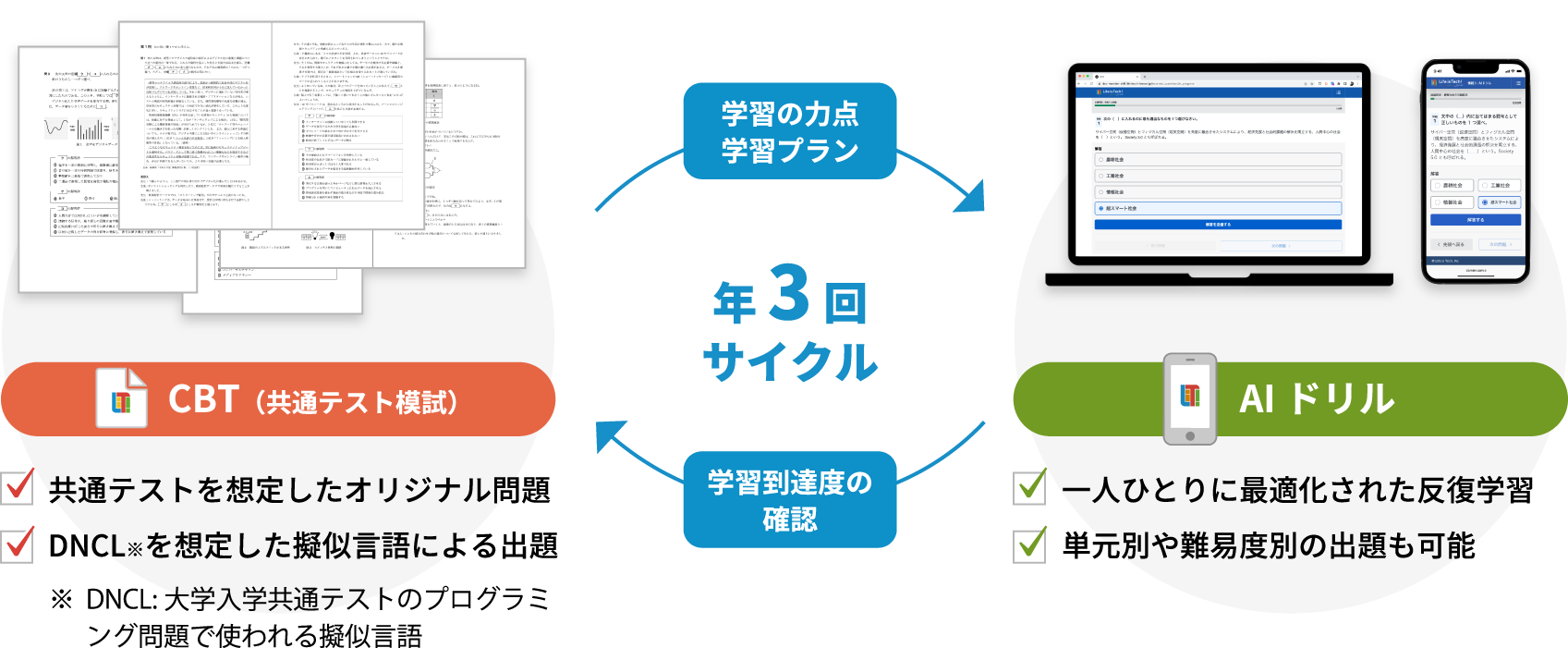 「情報Ⅰ・AIドリル」は、共通テストを想定した模擬試験(CBT)の結果から、一人ひとりの学習の力点と学習プランをAIが作成し、個別最適な反復学習で効率的な知識定着を実現します。「情報Ⅰ全対応コース」で「情報Ⅰ」の内容を一通り学び、「情報Ⅰ・AIドリル」を通じて個別の学習定着度に合わせた反復学習を行うことで、高校3年間を通じた学習定着をご提供します。