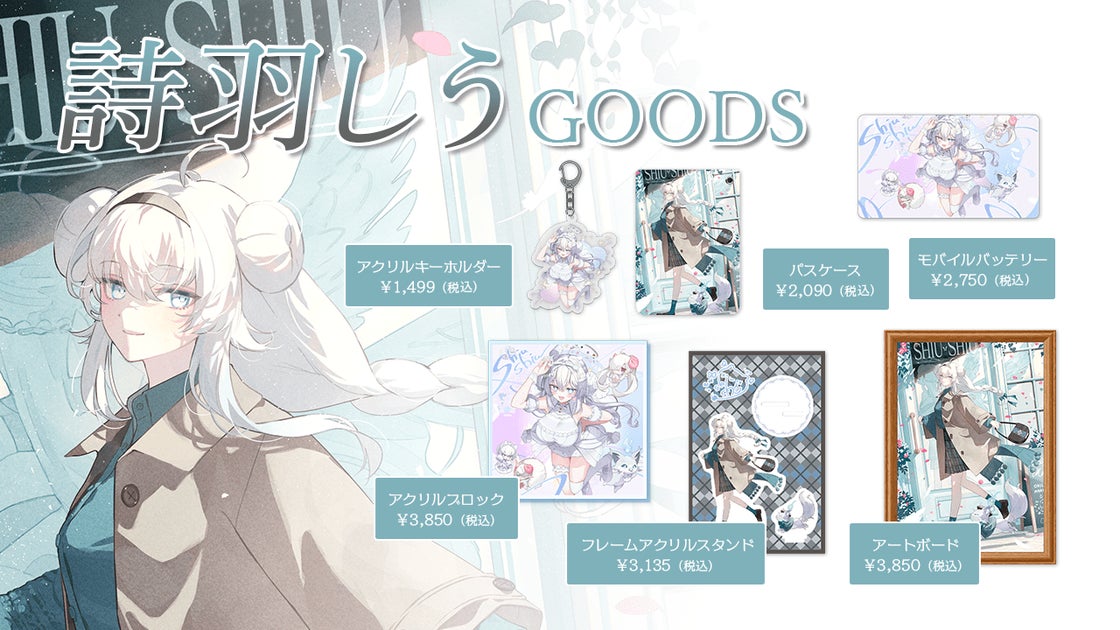 オリジナルグッズはアートボードやアクリルスタンドなど計6種類で、詩羽しうさんとうごんばさんの描き下ろしイラストが使用されています。