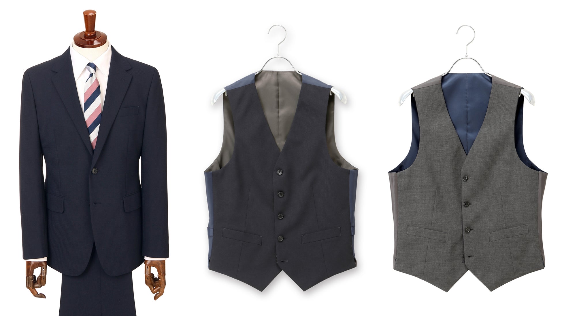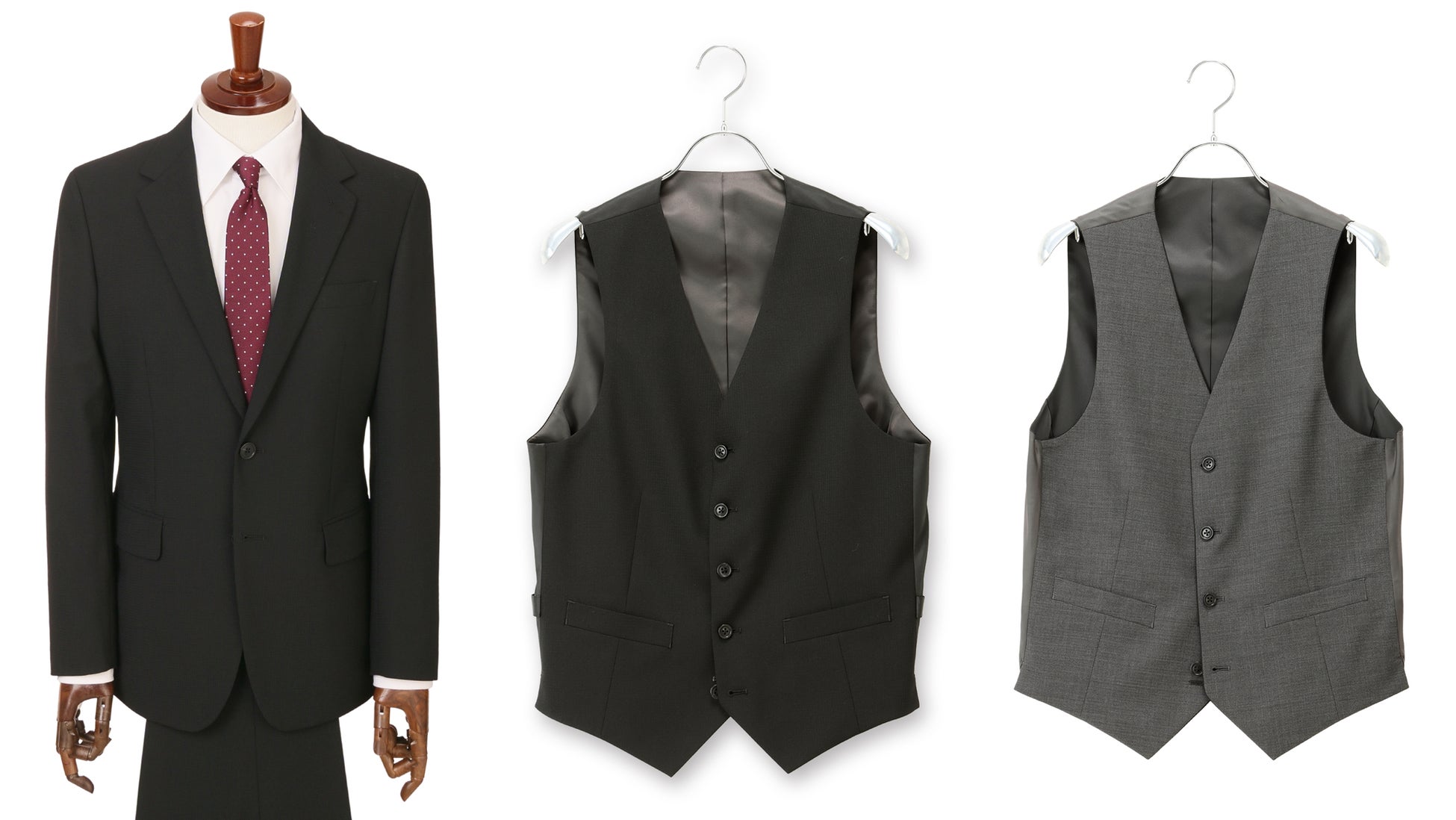 新CM「INIスーツチェンジ2024篇」では、ストレッチ性能に優れた「PT-9」のスーツに、フォーマル度が高まるベストを合わせたスリーピーススタイルを披露しています。