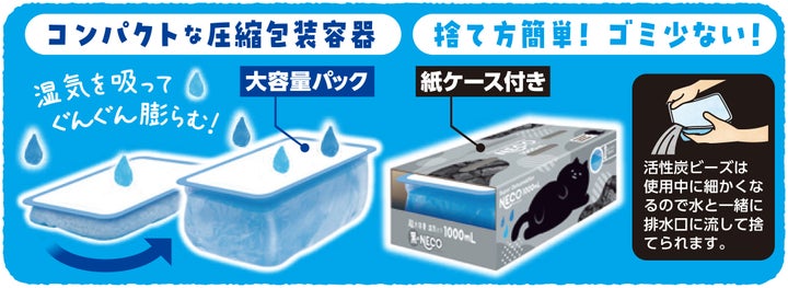 - 「ドライ&ドライUP 黒のNECO 1000mL」は、除湿剤として使いやすく、環境にも優しい商品です。