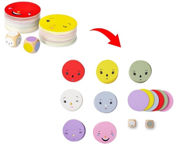 ぬいぐるみやサイコロには笑顔や怒り、不安などの表情が描かれており、感情を視覚的に表現することができます。