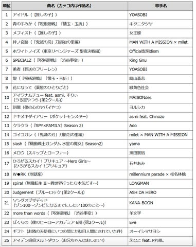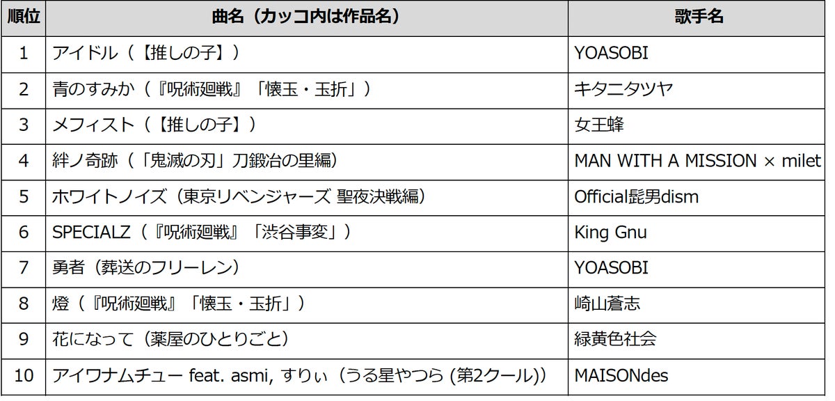 - 1位はYOASOBIの「アイドル」で、アニソンの枠を超えた人気曲