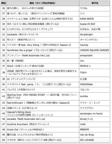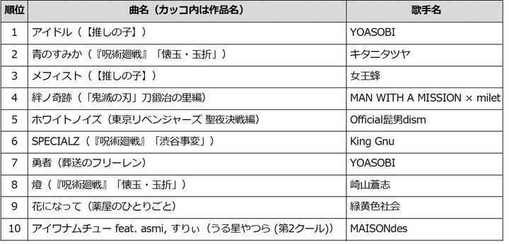 また、『鬼滅の刃』の刀鍛冶の里編のOPテーマ「絆ノ奇跡」や『東京リベンジャーズ 聖夜決戦編』のOPテーマ「ホワイトノイズ」もランクインしました。