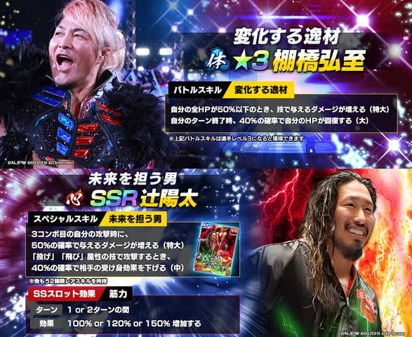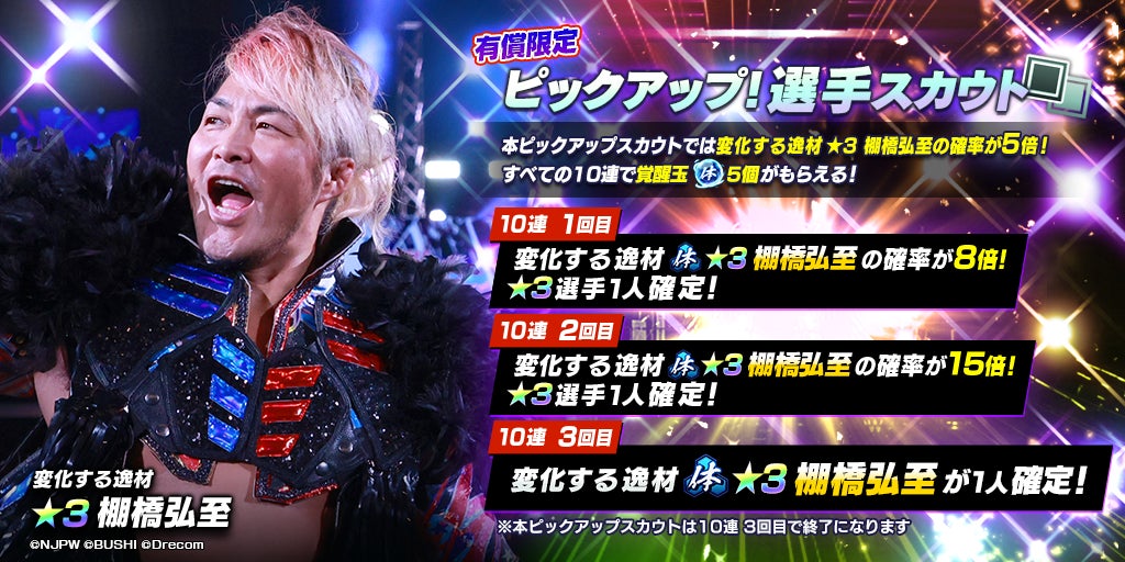 さらに、初登場の★3「[変化する逸材]棚橋弘至」のスカウト確率は通常の5倍となっています。