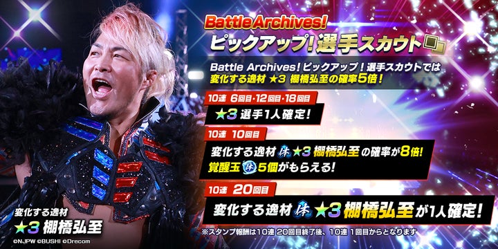 - 初登場の★3「[変化する逸材]棚橋弘至」のスカウト確率は通常の5倍