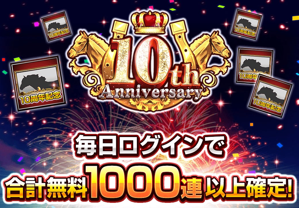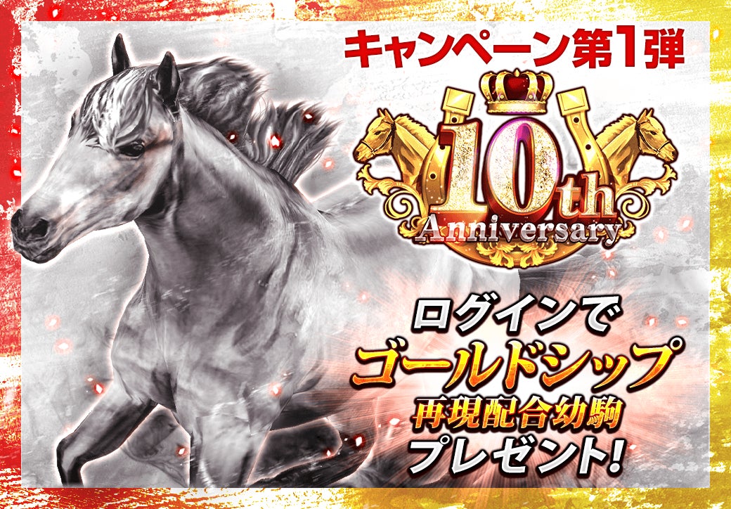 2013年5月23日にサービスを開始した競走馬育成ゲーム『ダビパク』は、多くのオーナーの皆さまに支えられ10周年を迎えます!皆さまへの感謝を込めて、累計1,000連分以上の無料種抽選や「再現配合幼駒ゴールドシップ」のプレゼントなどの豪華キャンペーンを開催します。