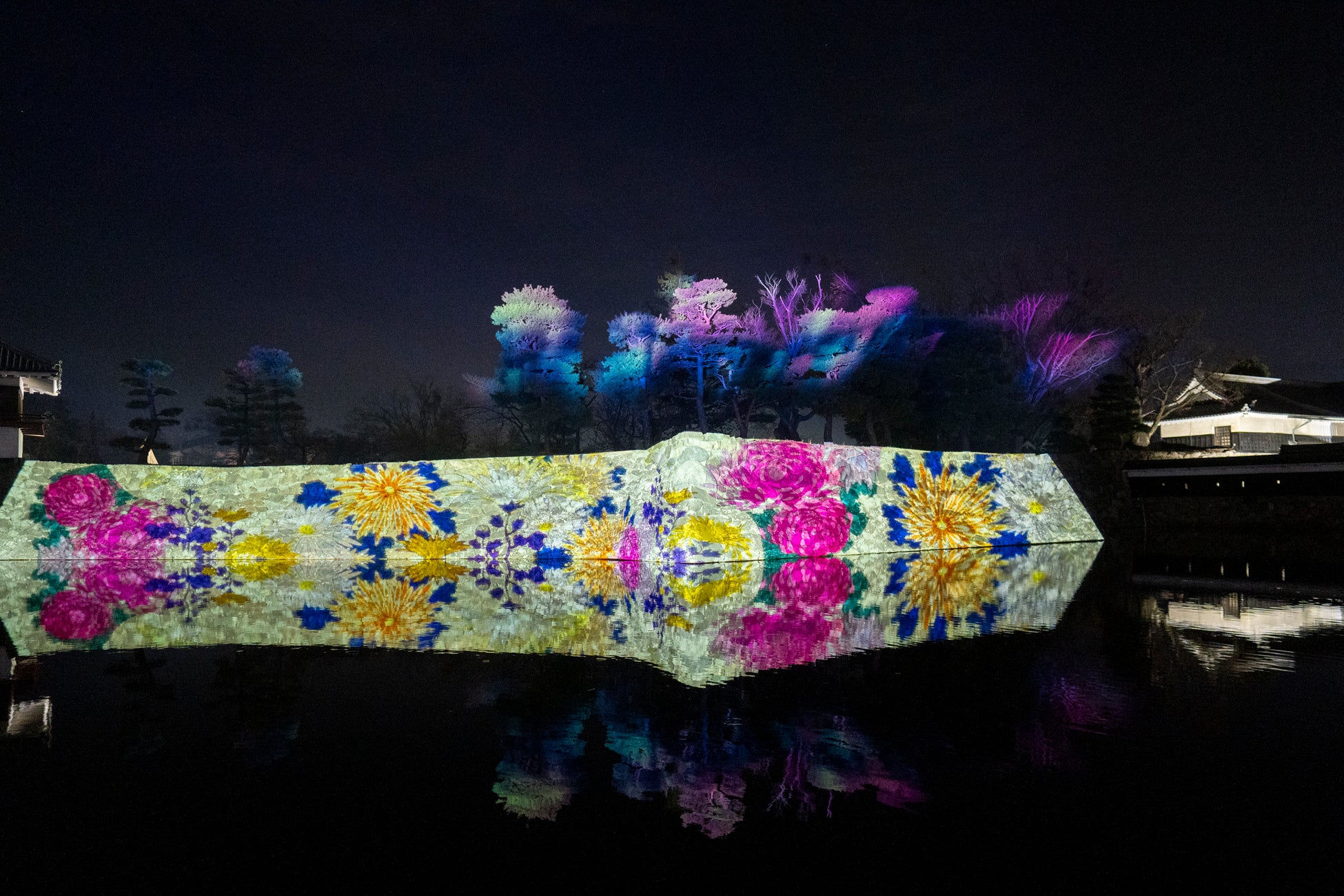 約9分間の映像が連続して投影され、壮大な天守や屏風絵、雪の結晶や氷をモチーフにしたデジタルアート、美しい花々などが幻想的に映し出されます。