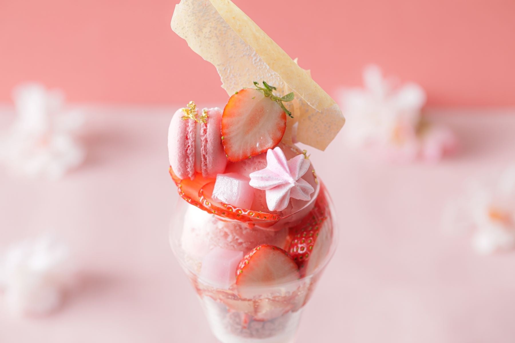下段には桜のアイス、フレッシュいちご、いちごチョコのフィアンティーヌ、トンカ豆のガナッシュモンテなどが使用されています。