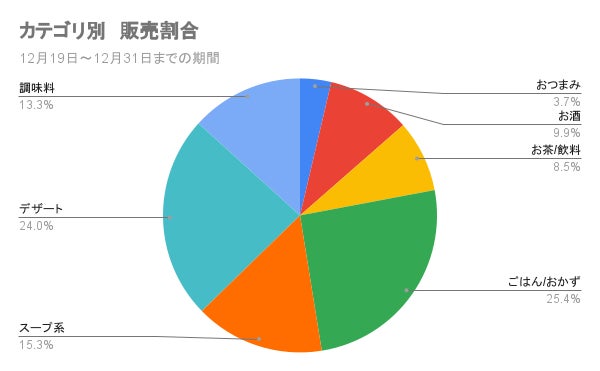 販売比率はおつまみ系3.67%、お酒系9.89%、お茶/飲料系8.47%、ごはん/おかず系25.42%、スープ系15.25%、デザート系24.01%、調味料系13.28%でした。