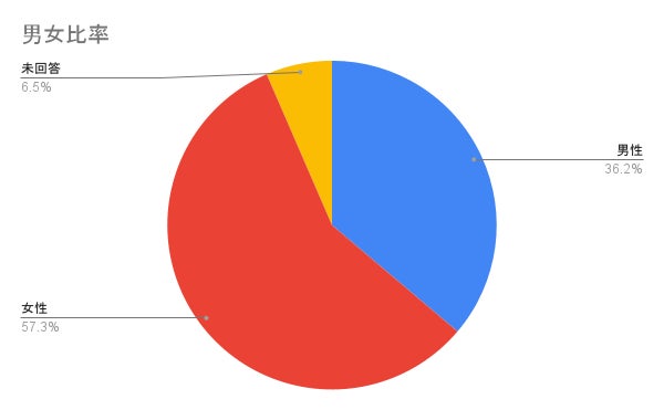 - アンケート結果によると、男女比率は男性36.2%、女性57.3%、未記入6.5%