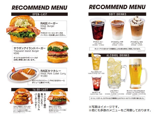 カフェ&バーエリアでは、グルメバーガーやカレー、コーヒーなどのメニューを提供します。