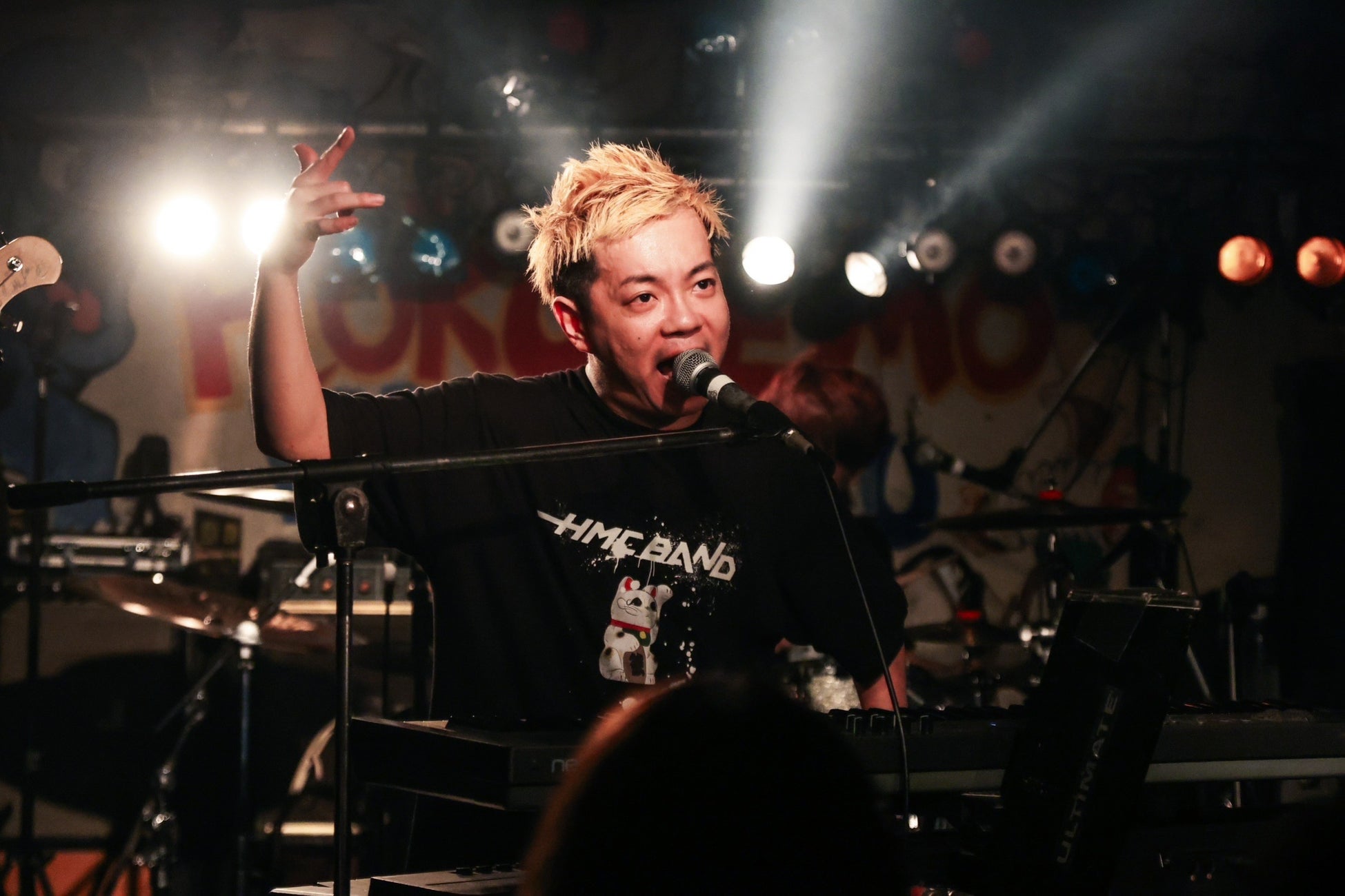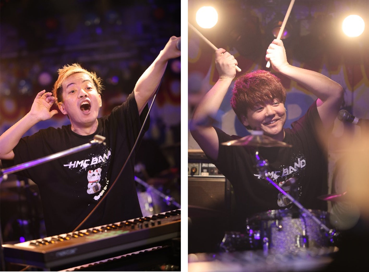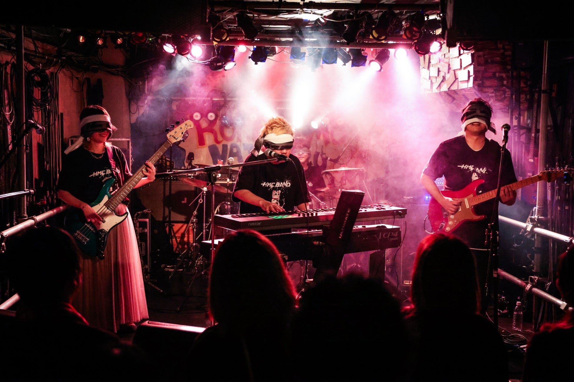 HMCは変拍子の曲で観客を踊らせ、目隠し演奏も披露しました。